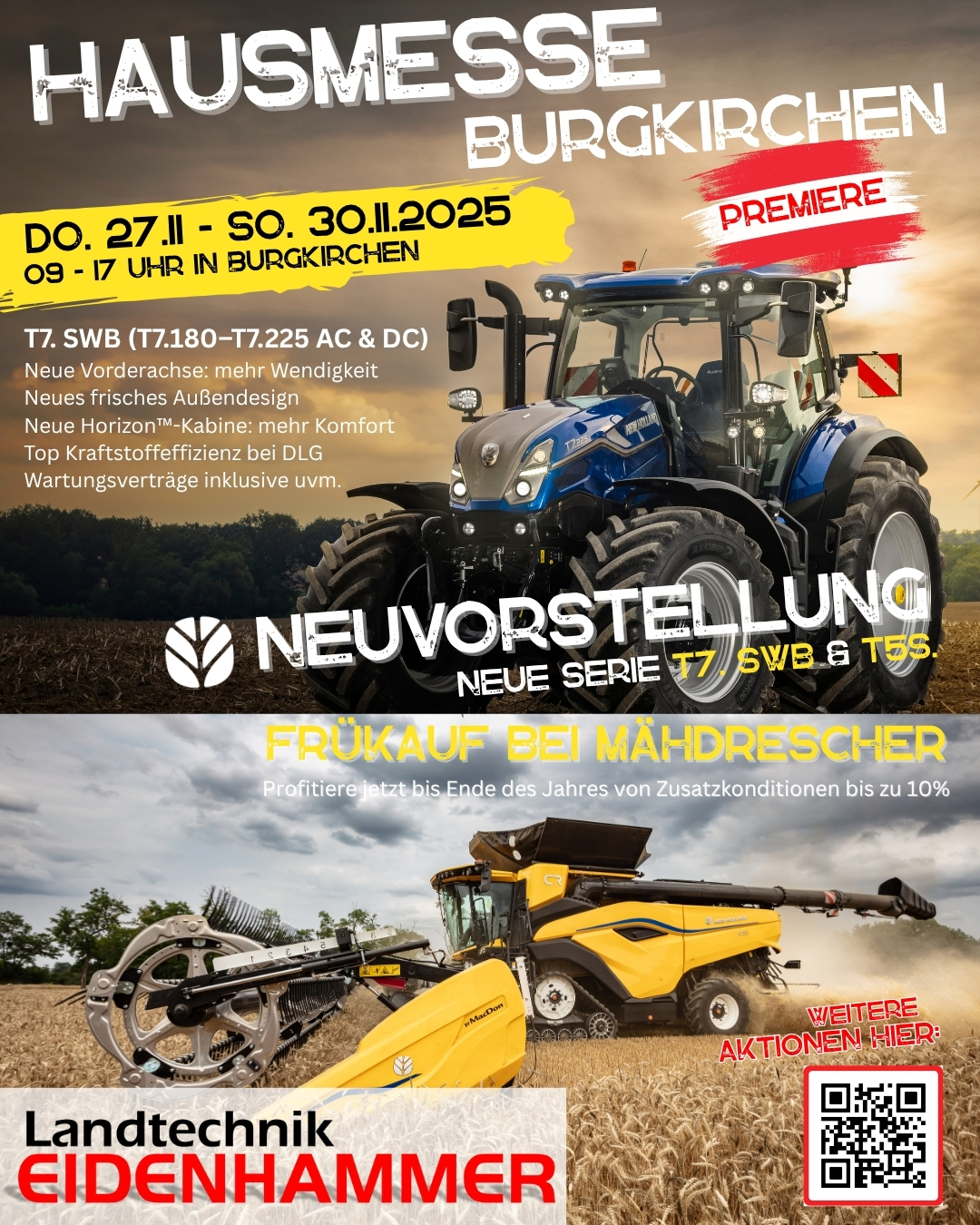 Tina Eidenhammer2025-11-05T11:58:08+01:00Große Hausmesse in Burgkirchen – Österreich-Premiere der neuen New Holland T7 SWB & T5S Ein Highlight für alle Landtechnik-Fans: Ende November verwandelt sich die Zentrale in Burgkirchen wieder in den zentralen Treffpunkt für Landtechnik-Fans aus ganz Österreich. Vom 27. bis 30. November 2025 von 09-17 Uhr laden wir zur traditionellen Hausmesse ein – und [...]