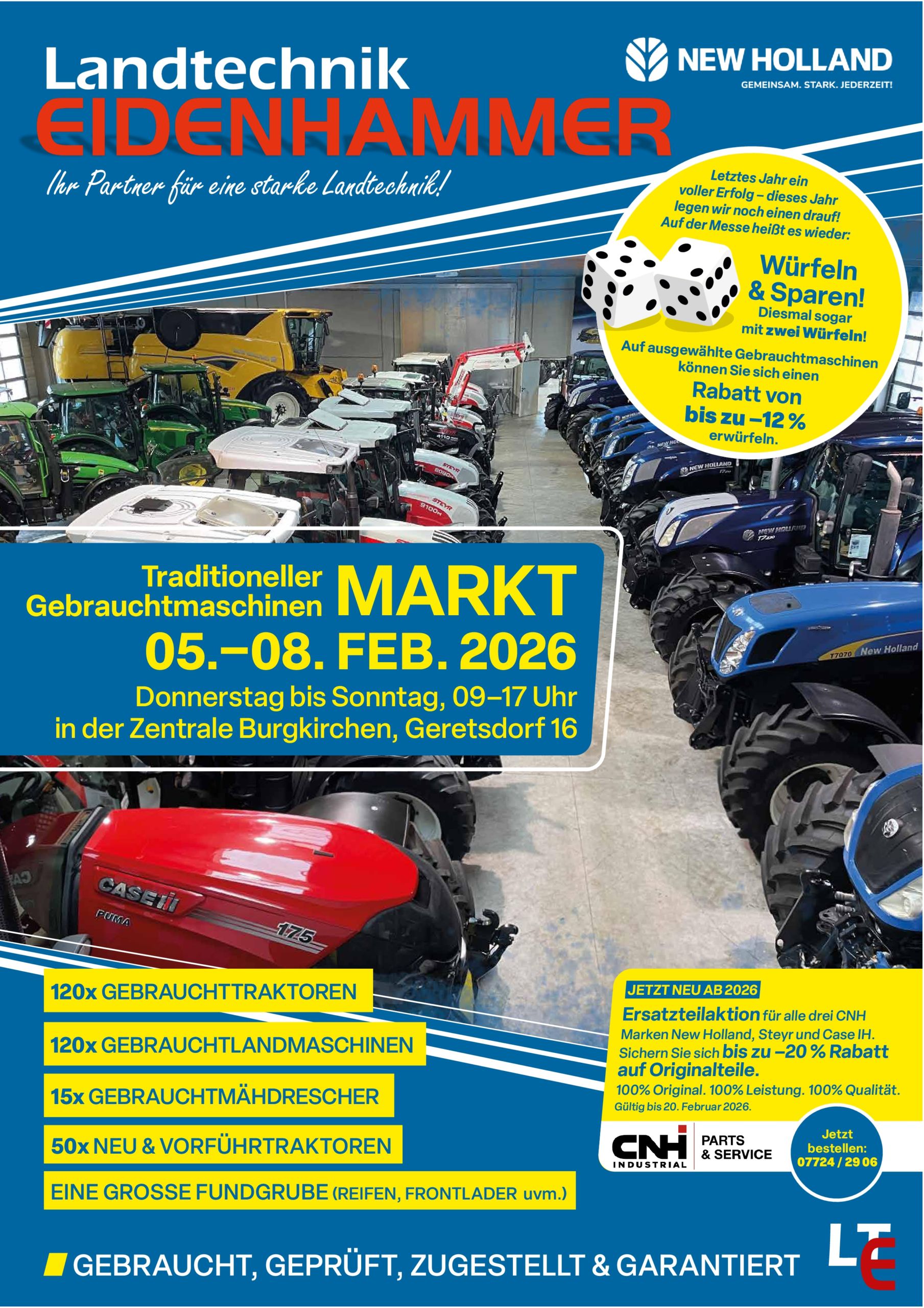 Würfelspiele beim traditionellen Gebrauchtmaschinenmarkt bei Eidenhammer in Burgkirchen | 05.–08. Februar 2026 | täglich von 09–17 Uhr Wenn die Temperaturen Anfang Februar meist im Minusbereich liegen, purzeln bei uns traditionell die Preise für Gebrauchtmaschinen. Von 05. bis 08. Februar 2026 laden wir Sie herzlich zu unserem traditionellen Gebrauchtmaschinenmarkt an unserem Standort in Burgkirchen ein. Große Auswahl für jeden Bedarf Wir freuen uns, Ihnen auch 2026 wieder eine besonders große Auswahl anbieten zu können:Über 120 Gebrauchttraktoren, rund 120 Gebrauchtlandmaschinen sowie etwa 50 Vorführ- und Ausstellungsmaschinen stehen für Sie bereit.Egal, ob Sie einen kompakten Traktor ab 40 PS oder eine leistungsstarke [...]
